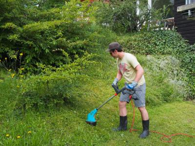 Das genussvolle Pilzessen auf der Terrasse wird plötzlich leicht "gestört" durch drei! heftig stinkende und röhrende Rasenmäher. Der Tritscher, Hermann ist mit zwei Mädels gekommen und sie mähen in 5 Minuten den englischen Rasen und bleiben noch auf einen Schwatz.